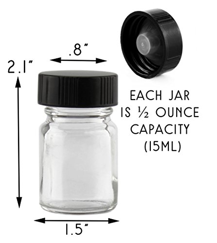 CAPACITY: Each jar ½ ounce (15ml) capacity; SIZE: 2.1 inches tall by 1.5 inches diameter; mouth opening 20mm wide