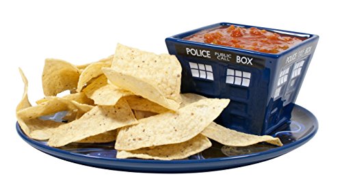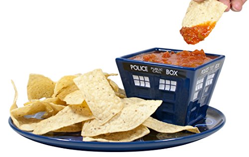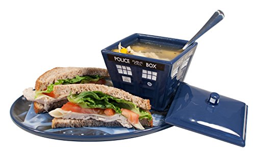 Doctor Who fans!The adventure continues for lunchtime, game time, or party time.! Thanks to the TARDIS Soup Sandwich Vortex, you can enjoy a nice toasted cheese or bacon sandwich as the TARDIS flies up through the Time Vortex with a piping-hot bowl of tomato soup. Or invite your favorite time machine to your next football party to serve your specialty: onion dip and crisps guacamole and tortilla chips veggies and home-made salsa · melted cheese and pretzels hummus and pita bread fish fingers and custard This lovely ceramic TARDIS is dishwasher safe. microwave safe Holds 16 oz. Now you can entertain friends and guests like a Time Lord! * World Cup or Superbowl - up to you Shipping Note: Shipping to Alaska, Hawaii, PO Boxes and APO addresses not available for this item