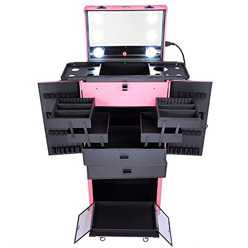 AW Pink Rolling Makeup Case Pro Hair Stylist Barber Artists Case Multifunction Lighted Lockable
