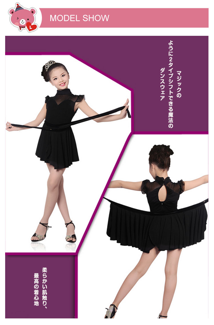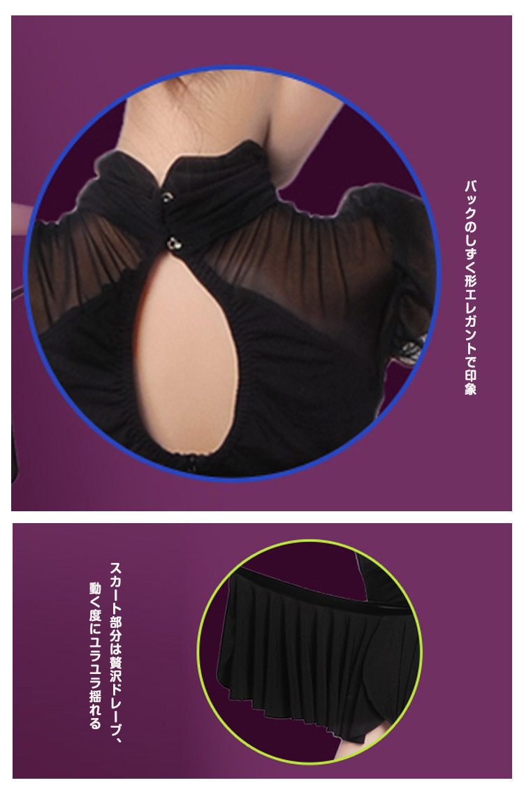 | マジックのように2タイプシフトできる魔法のダンスウェア情熱なラテンダンスにピッタリ!柔らかい生地で贅沢なドレープが自然に生まれ、動く度に揺れる美しいシルエット胸元チュール切り替えでエレガントな印象にバックデザインもカワイイPOINT柔らかい肌触り、最高の着心地 | |