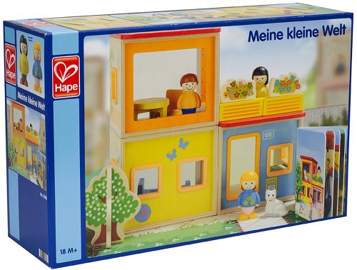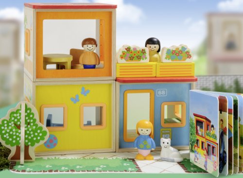 - Feature : Enhanced with bright fashion colors and graphics, these three boxes easily stack and separate for imaginations to run wild / Three stackable rooms, furniture and a family with pets / The three figures can be a family or shopkeepers or friends who live and work on this wood play mat with grass and sidewalks / Accessories include a tree, chair, table, green kitchen, bed, flower boxes and balcony / A picture boardbook about life in the city is also included