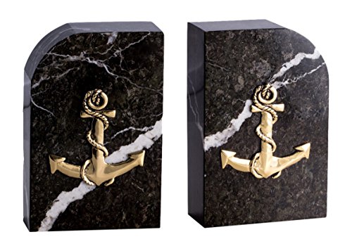 Paloma Collection AJ-R10C Marble Bookends with Antique Gold Plated "Anchor" Emblem, Black Marble