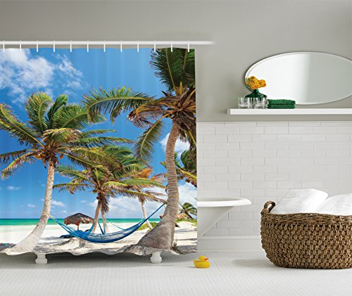 Ambesonne Beach Hammock Decor Collection, Hammock and Palm Trees Sand Sunny Beach Scenery Pattern, Polyester Fabric Bathroom Shower Curtain Set with Hooks, 75 Inches Long, Green Blue Ivory