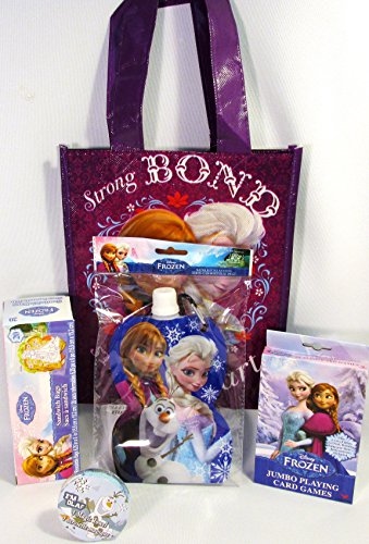 Bundle - 5 Items: Disney Frozen Theme - Reusable Tote, Water Bottle with Keyring, Jumbo Playing Card Games, Olaf Magic Towel, and Box of Sandwich Bags Bundle includes: (1) Small reusable 8" x 10" x 5" tote with "Strong Bond Strong Heart" imprint on both sides of the tote. (2) Flat Flexible plastic water bottle with keyring holds 7.439 fluid oz and measures 7.25" x 4.5". (3) Jumbo Playing Card Games including Crazy Eights, Go Fish, Rummy, and more. (4) Olaf Magic Towel is 100% cotton and measures 11.75x11.75". (5) 20 resealable sandwich bags, size 6.25" x 6". Water bottle is ideal to be attached to back-packs, book-bags, beach-bags, purse, or belt loops. Great to use for school field trips or road trips. Olaf Magic Towel: Place in warm water and watch them grow to full size, 11.75 inches x 11.75 inches (29.8cm x 29.8cm)! Reusable Tote can be used to carry child's small toys and snacks to take on road trips. Jumbo Playing Cards, large enough for small hands! Not recommended for children younger than 3 years of age. Adult supervision recommended.Feature