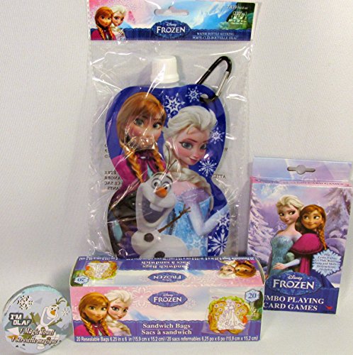Bundle includes 5 Disney Frozen theme items: Reusable Tote, Water Bottle with Keyring, Jumbo Playing Card Games, Olaf Magic Towel, and Box of Sandwich Bags