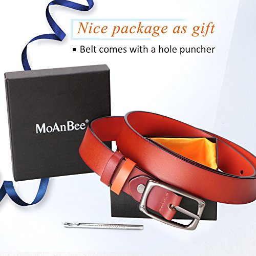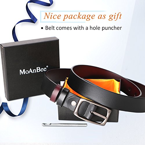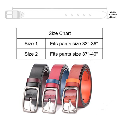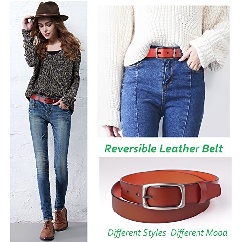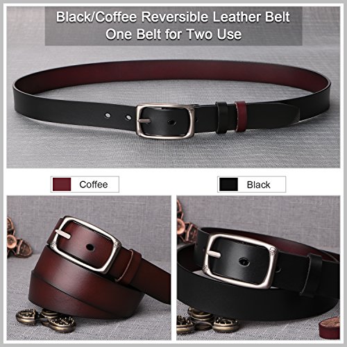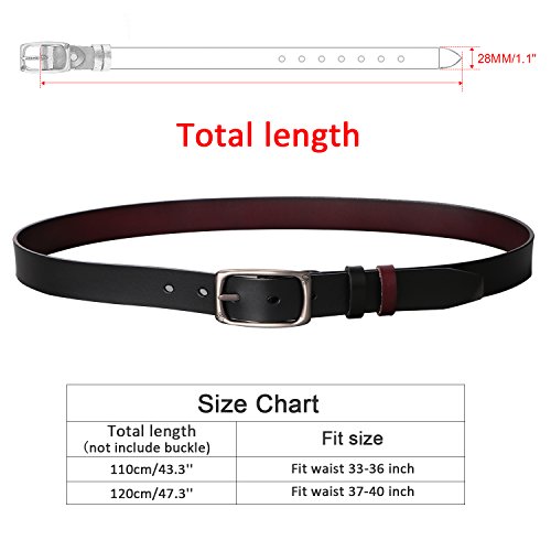 Binding : Apparel Product Description WHY NOT choose this Fashion Reversible Leather Belt for Women? 1. Quality Belt Strap - This women belt is made of high-grade cowhide leather material, last longer than normal leather belts. 2. Simple Style Buckle - Durable solid alloy buckle, classic and never out of date. 3. Reversible Leather Belt - Two sides, two color, two style! Choose according to your outfit. 4. Great for Most Ladies - A nice everyday wear belt for most girls/women. 5. Suit for Most Occasions - Not only formal(prudent black/dark coffee/brown), but also causal(passionate red/blue/orange). 6. Wild-matched Belt - This leather belt goes well with jeans, pants, shorts, suit trousers, dresses etc. It's an amazing wardrobe addition. 7. Adjustable Size - Belt Strap Width 28mm (1 1/8 inch), fit for most pants loops. - SIZE ONE(total length 110cm/43.3in), fit waist size 33in-36in; SIZE TWO(total length 120/47.2in), fit waist size 36in-39in. - We suggest to measure your waist size before purchse, or choose the large size(because you can easily DIY cut down the extra length). 8. Top Choice As Gift - A nice gift for families or friends(a birthday gift for daughter, a Thanksgiving Day gift for Mom, an anniversary gift for wife...) 9. Loyalty Service - We offer one-year guarantee, refund or return for quality problems. If any problems before/after an order, just contact us anytime, we will reply in 24 hours with satisfied solutions. Steps of DIY cutting belt strap Step 1: Detach use the screwdriver Step 2: Cut down the extra length Step 3: Overlap to make new hole with puncher Step 4: Secure it firmly with closure Notes 1.Measure your waist where you wear the belt on pants. 2.DON'T CUT TOO MUCH at the first time, cause it won't come back. 3.Don't punch new holes near the original holes area. 0