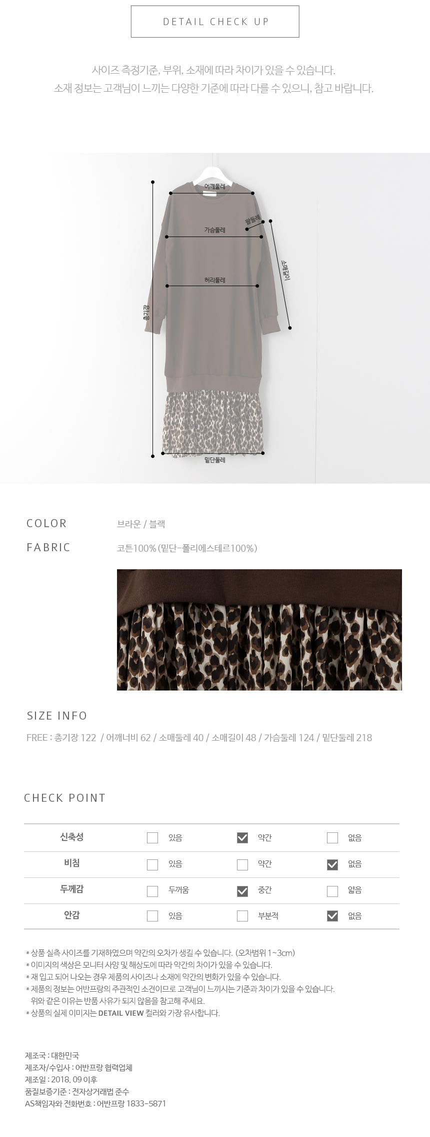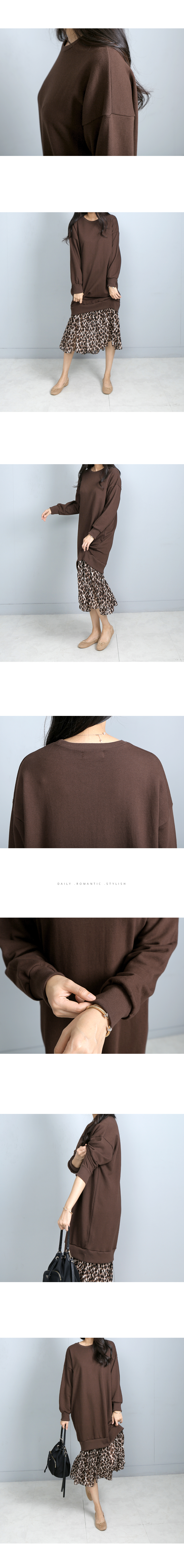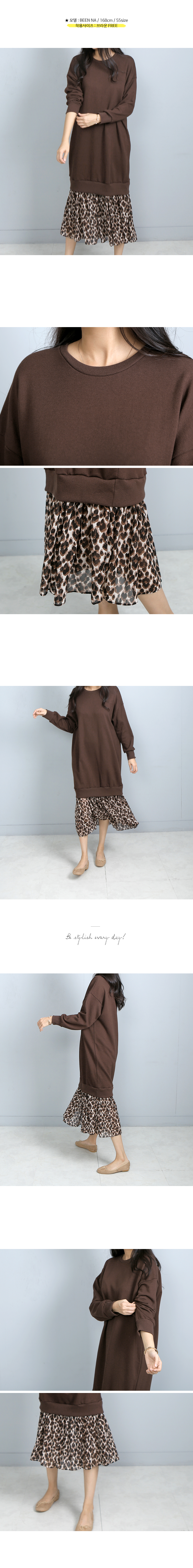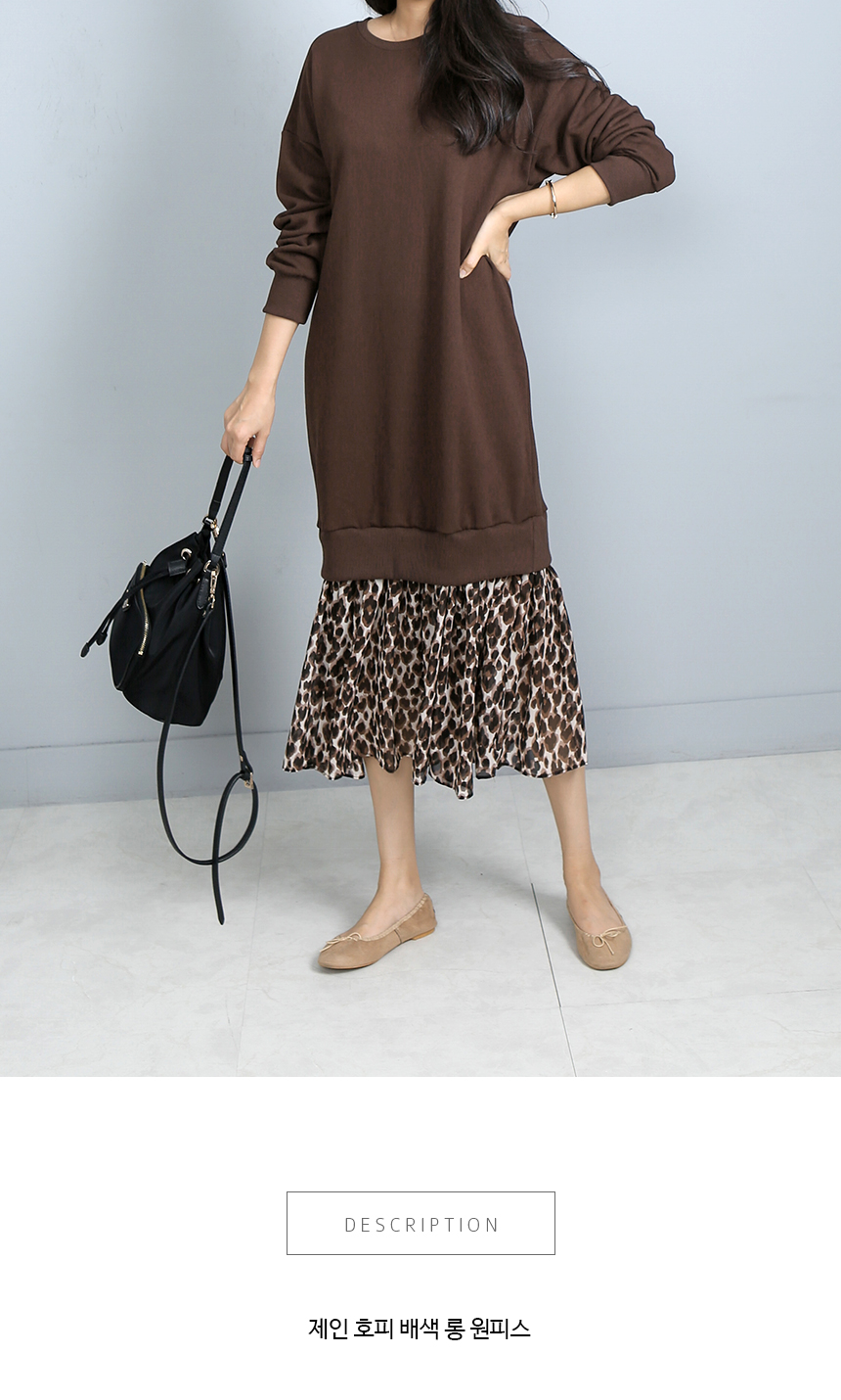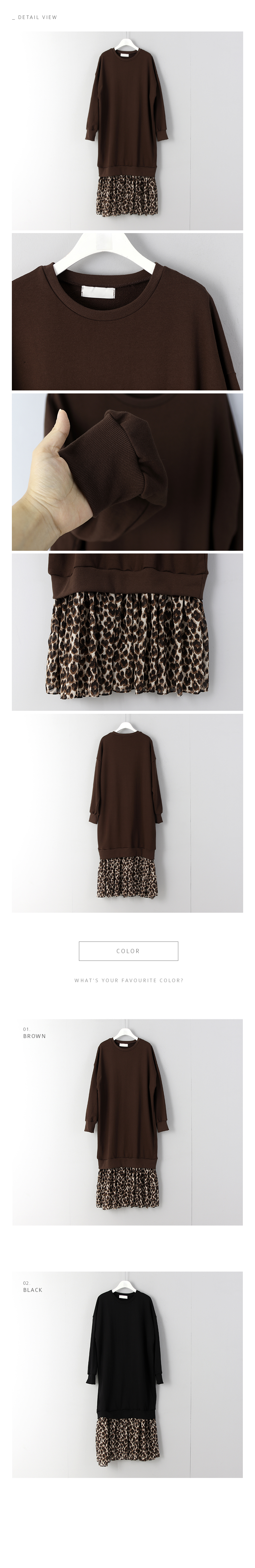 롱한 길이감의 맨투맨 원피스 밑단에 호피 패턴의 쉬폰 소재를