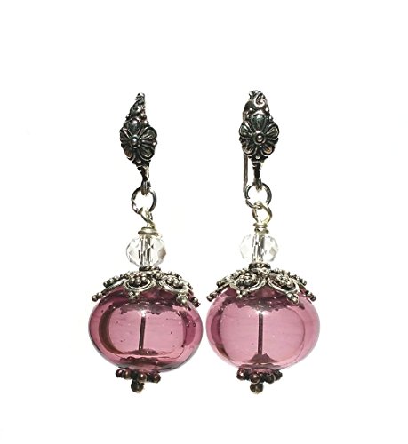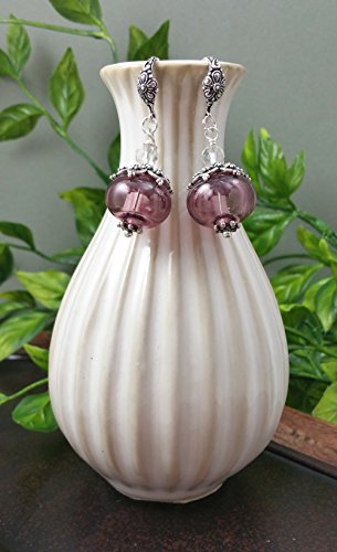 -. Title : 1 Pair of Plum Purple Amethyst Hollow Bead Earrings Transparent Glass Bubble Lampwork