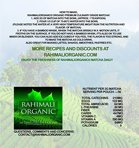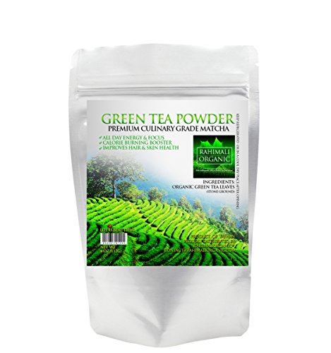 -. Binding : Grocery -. Brand : RahimAliOrganic® -. Color : green -. Feature : ALL DAY ENERGY & FOCUS: Lift your vitality and concentration with the slow release natural energy from Organic Matcha / 137x ANTIOXIDANTS OF BREWED GREEN TEA: Organic Matcha Green Tea can only be used in a powdered form because, unlike brewed green tea, it contains the entire tea leaf which dramatically increases the nutritional content. / CALORIE BURNING BOOSTER: Support your weight loss goals with an all-natural way to increase your body's metabolism / Great for general health / ENERGY POWERHOUSE, NATURAL MOOD ENHANCER & MENTAL FOCUS: Boost your vitality with the unique ability to reduce stress levels, focus the mind, and provides all-day energy. -. Label : RahimAliOrganic® -. Manufacturer : RahimAliOrganic® -. NumberOfItems : 1 -. PackageQuantity : 1 -. ProductGroup : Grocery -. ProductTypeName : GROCERY -. Publisher : RahimAliOrganic® -. Studio : RahimAliOrganic® -. Title : RahimAliOrganic® Premium Organic Matcha, Green Tea Powder