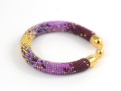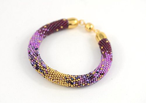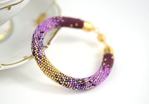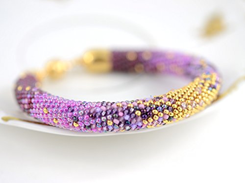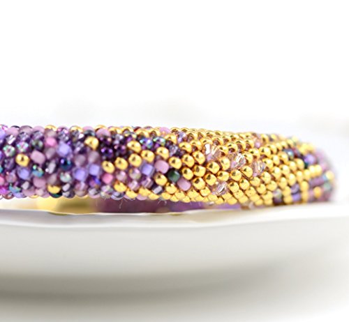 -. Title : 01 Antistress bangle bracelet - Irises - Bead Crochet Bracelet - Beaded Bracelet with 24K seed beads & Swarovski Crystal Antistress bracelet Lilac Violet Gold
