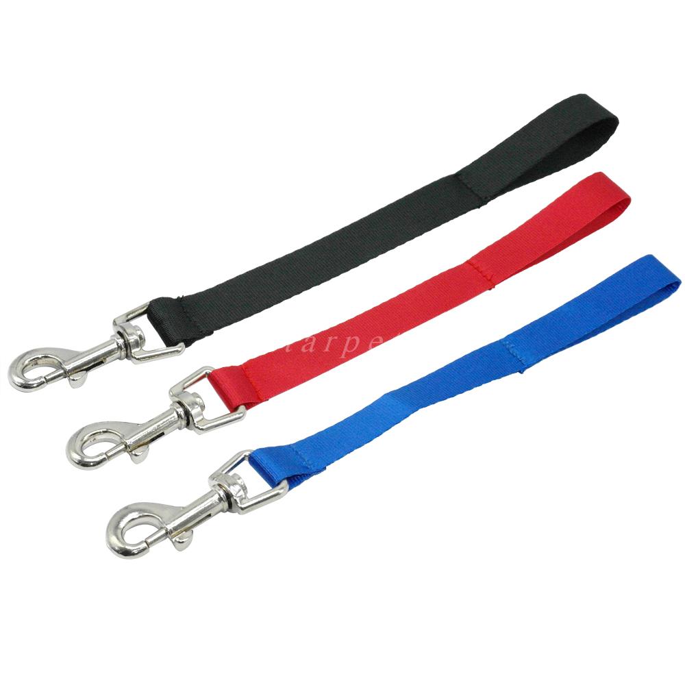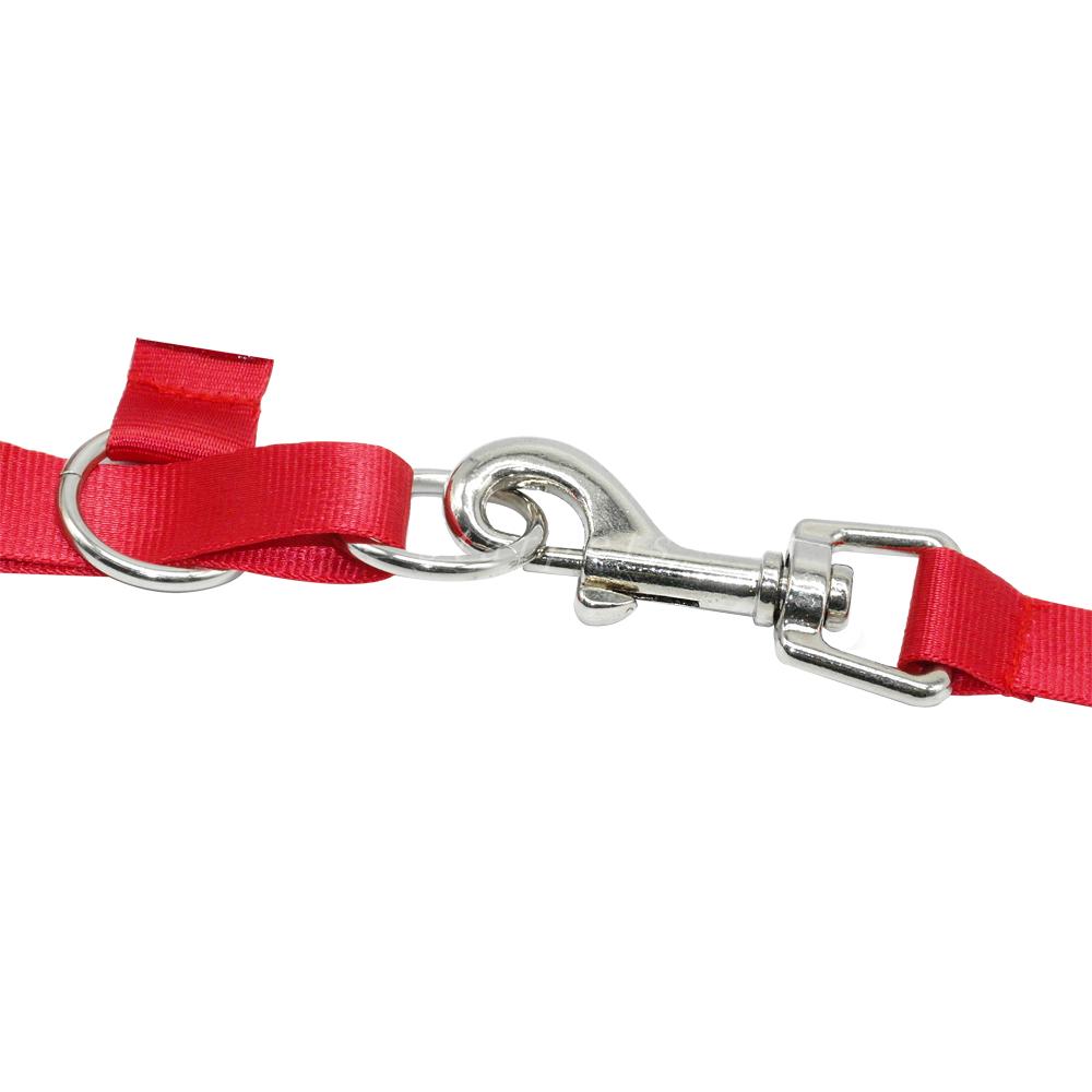 The leash fastens to the halter under the dog\'s chin is a ring that\'s also attached to the nose strap.