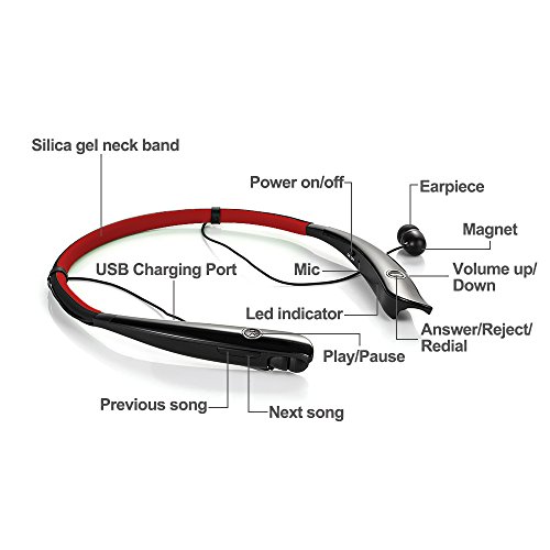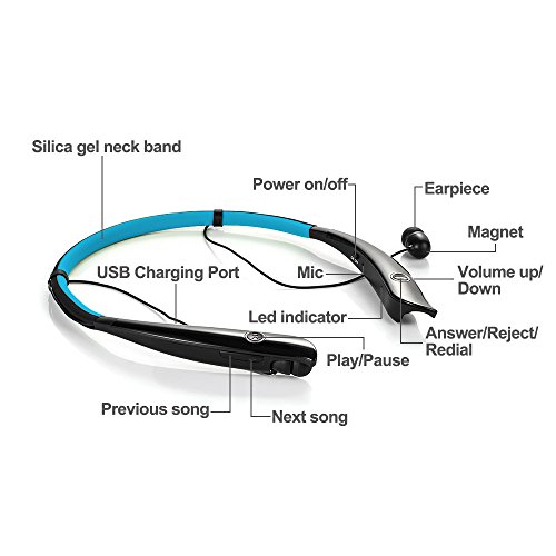 -. Feature : Comfortable hands-free neckband style, feel free to make a call or listen to music with your friends even when your hands are busy / High capacity 200 mAh, you can have 12 hours talk time, 10 hours play time, and 500 hours standby time before you charge the headphone / Easy pairing with phones with Bluetooth 4.0, also, you can leave your phones and the headphone within 10 meters (no obstacle) / Voice Actions with compatible phone, Call, Answer and Redial the last number. And it also has battery status alert. It will vibrate when a call is coming in / Built with CSR8635 chip, noise reduction & echo cancellation,sweat-proof, Apt-X Technology