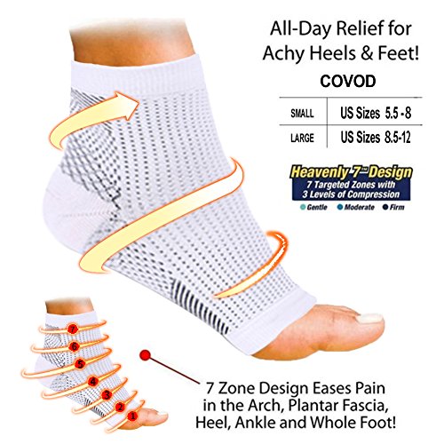 - ★ANKLE SLEEVE THAT RELIEVES PLANTAR FASCIITIS: Covod ankle socks support features Covod on the bottom of the sleeve that helps to relive plantar fasciitis pain by compressing the plantar fascia ligament. ANKLE BRACE WITH GRADUATED COMPRESSION, TARGETED Covod AND ADVANCED ANKLE SUPPORT: Our Covod sleeves design provides support in the ankle area without restricting motion, also improves circulation, reducing inflammation and expediting the healing process.