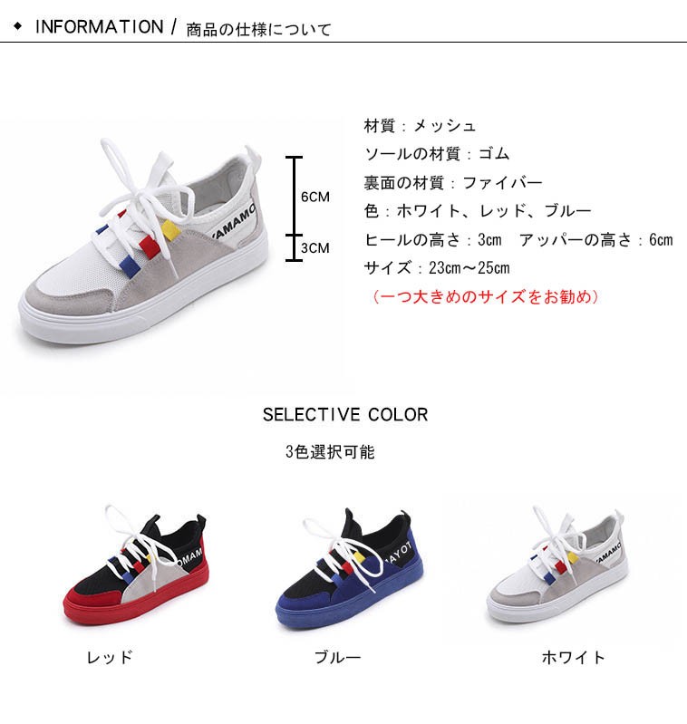 材質:キャンパス+ゴム 色:ブラック、ピンク、ホワイトヒールの高さ:3cm約 アッパーの高さ:6cm約 サイズについてEU36=22.5cm EU36=23cm EU37=23.5cm EU38=24cm EU39=24.5cm EU40=25cm(一つ大きめのサイズをお勧め)注意:※ サイズなど、商品詳細を必ずご確認後、ご了承頂いた上でご購入をお願いします。また、採寸方法違いにより、0.5~1cmの誤差がございますので、ご了承ください。商品内容:1xスニーカー特徴:【軽量、通気性よい】ゴムのソールとキャンパスの材質でスポーツシューズならではの軽さを実現し、通気性もよいです。どんな季節でも着用します。 軽量なので、ランニングや歩くや他の運動が易くになりました。【ファッションな配色】ファッションな配色で、シューズがファッションになり、女性に最適です。中学生などに通学靴としてもよい選択です。 【ゴムのソール耐滑】柔らかい材質で作って、ゴムのソールので、耐滑のです。スムーズな足運びをサポートします。球技や他の運動にもスムーズになりました。【利用場合】スポーツだけでなく、通勤や通学やアウトドア、普段履きとしても カジュアルなコーディネートをお楽しみい ただけます。