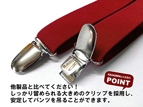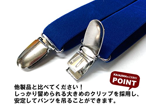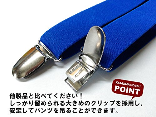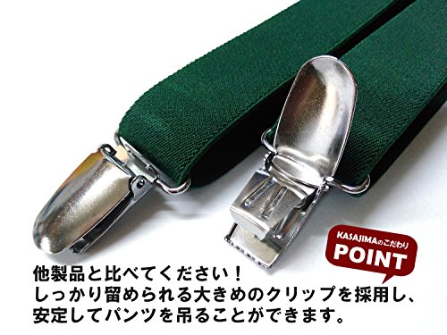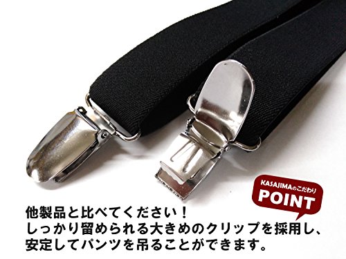 Binding : Apparel Product Description Suspenders by KASAJIMA Made in japan. This heavy-duty suspender is made of a quality elastic material and is 1.18 inches wide. Suspenders feature silver tone sports clips. Suspender back is constructed with traditional adjustable triangle metal back. Great quality Clips that will never slip -slide or fly off your pants. Wear them with pride! And never again allow your pants to be a nerve wreck. 0
