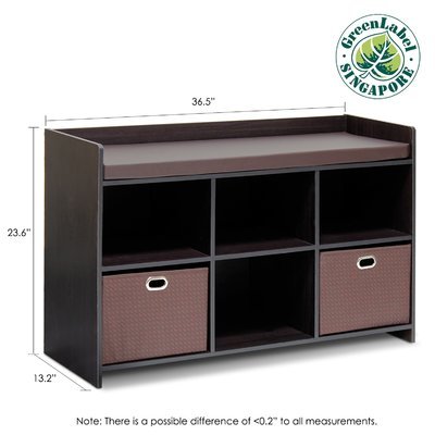 -. Brand : Makayla -. Color : Espresso/Brown -. EAN : 0686926137732 -. Feature : Simple design yet functional and suitable for shoes organization that keeps walkway tidy / Comes with comfy cushion / Non-woven bin / Versatile and 6 cube organizers with 2 foldable non-woven bins and soft bench that gives place to sit / Sturdy on flat surface. Additional storage bins cannot be added. -. Label : Zipcode Design -. Manufacturer : Zipcode Design -. Model : ZIPC8165 -. MPN : ZIPC8165 -. PartNumber : ZIPC8165 -. ProductGroup : Furniture -. ProductTypeName : HOME_FURNITURE_AND_DECOR -. Publisher : Zipcode Design -. Size : 23.6'' H x 36.5'' W x 13.2'' D -. Studio : Zipcode Design -. Title : Shoe Storage Bench For Entryway, Includes Comfy Cushion Seat, 6 Cube Organizers And 2 Foldable Bins, Made Of Quality Wood, Presented In Espresso Finish -. UPC : 686926137732