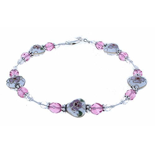 -. Title : Womens Cloisonne' Hearts, Czech Fire Polished Glass & Sterling Anklet with Daisies