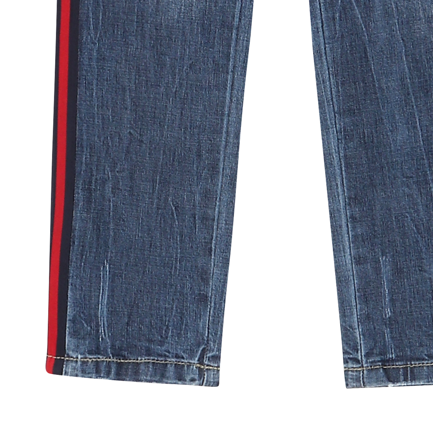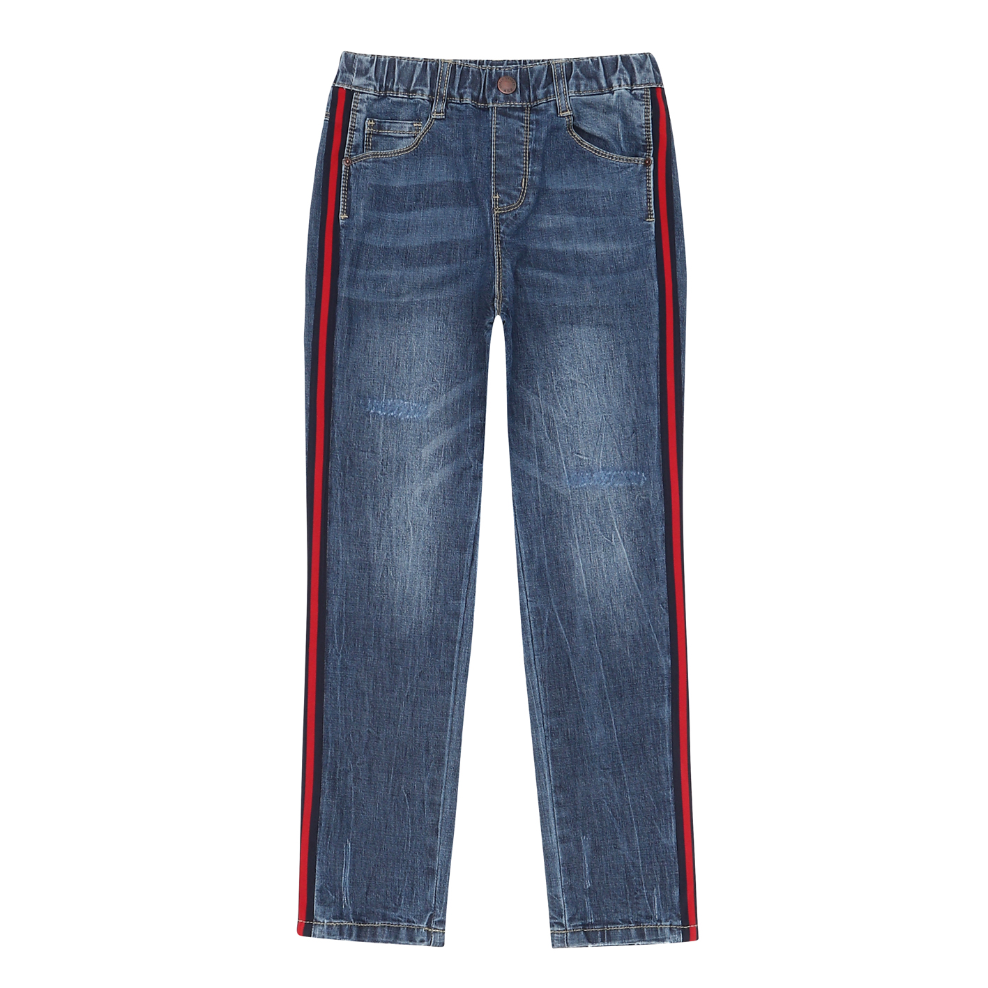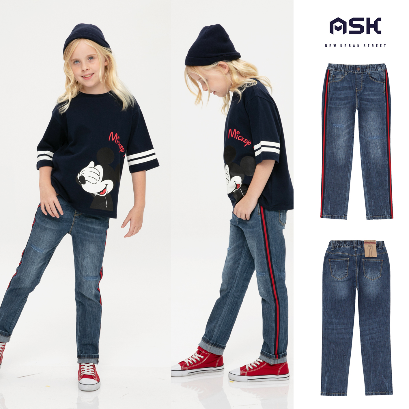 옆선테잎장식이 돋보이는 트랜디한 여아 데님팬츠.슬림한ㄴ핏으로 부분 스크레치 구제와 과하지않은 시와(구김)워싱으로 세련된느낌.