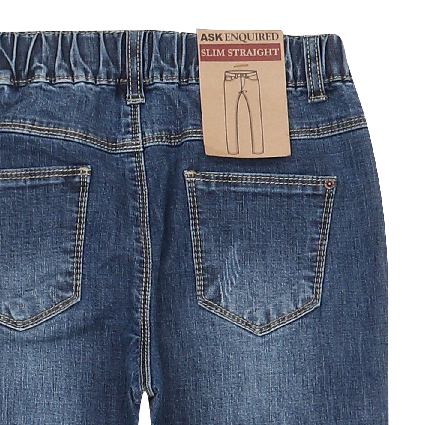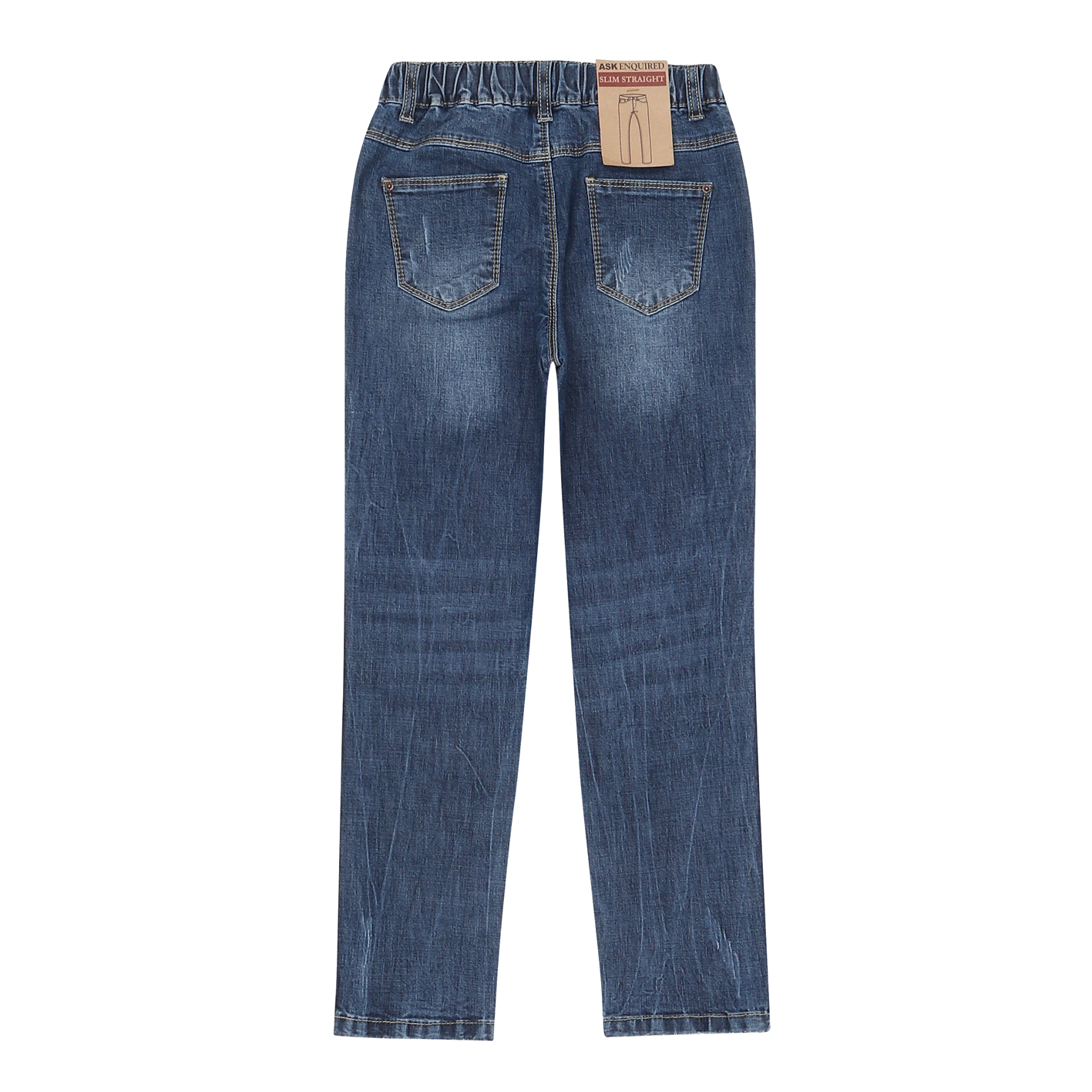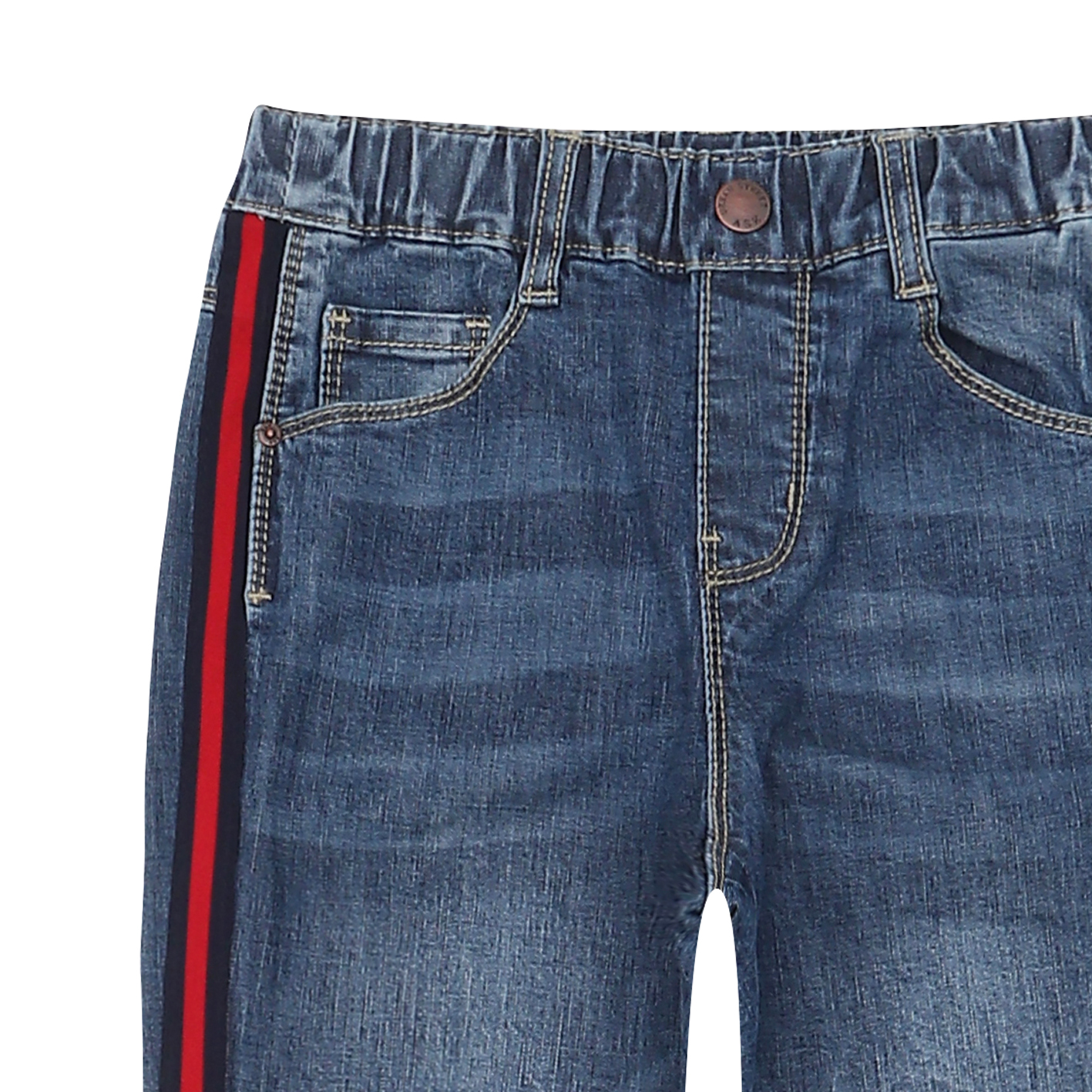 옆선테잎장식이 돋보이는 트랜디한 여아 데님팬츠.슬림한ㄴ핏으로 부분 스크레치 구제와 과하지않은 시와(구김)워싱으로 세련된느낌.