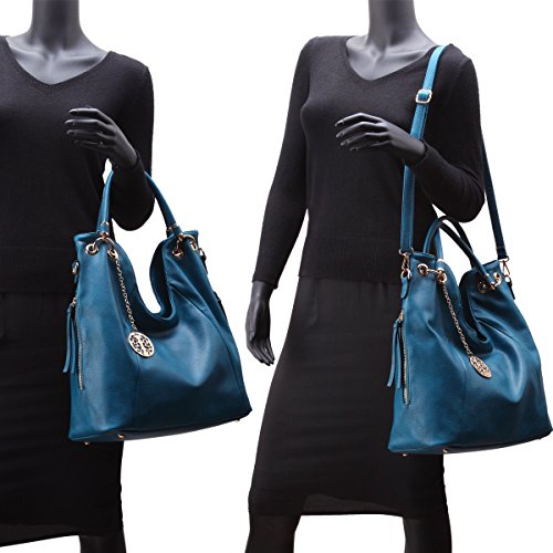 Detailed Construction:Deep Top Zipper Closure + Rolled and Gold Ring Decorated Faux Leather Handle + Flat Studed Bottom Design + Interior Zipper Pocket + Front Hanged Gold Accent + Top Interior Cell Phone and Item Pockets + Removable and Adjustabel Shoulder Strap