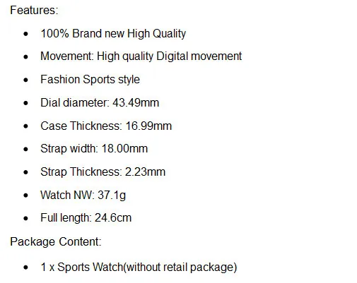 Feature:Water Resistant,Shock Resistant,Repeater,Auto Date,LED display,Safety Warning