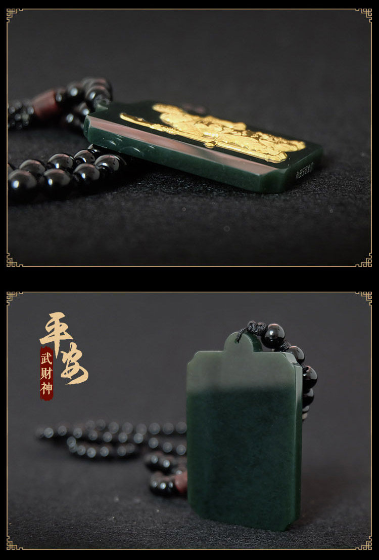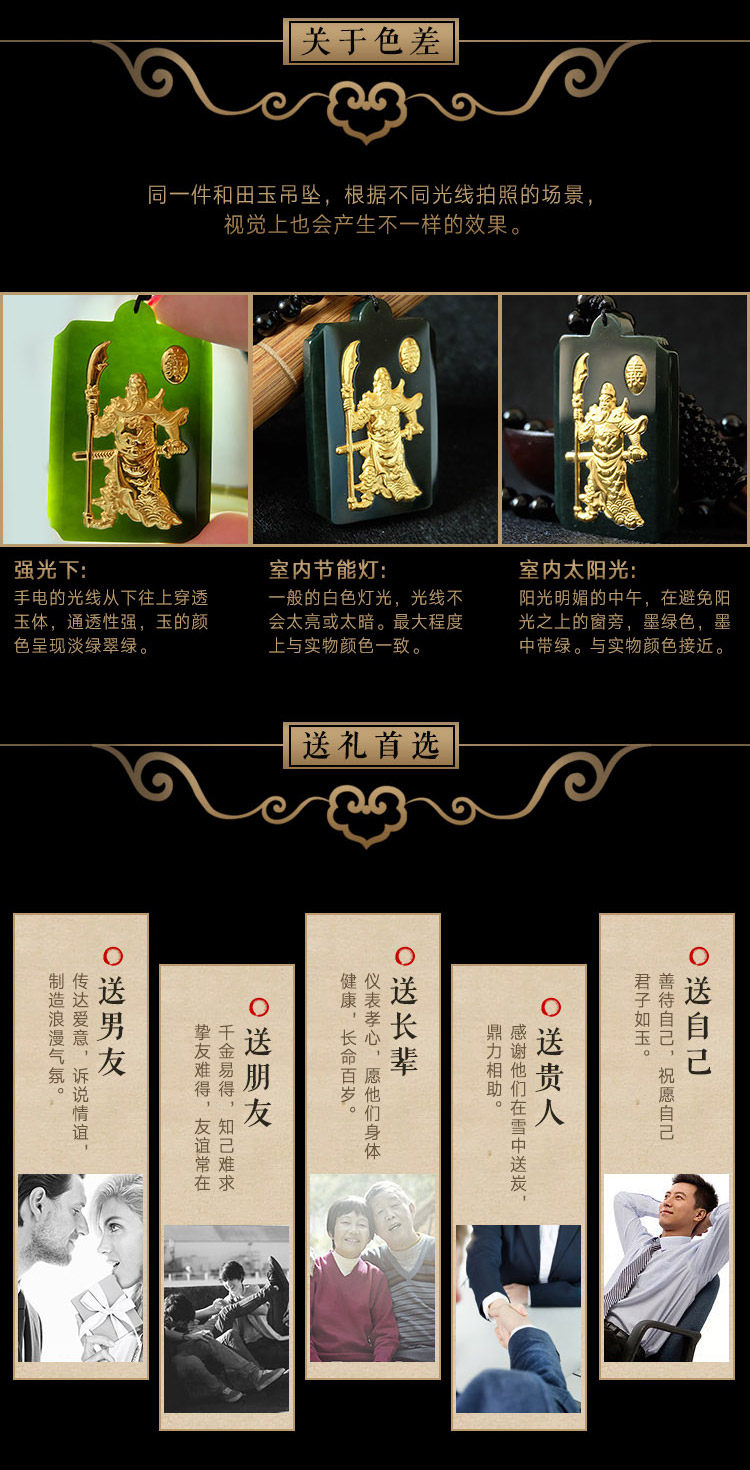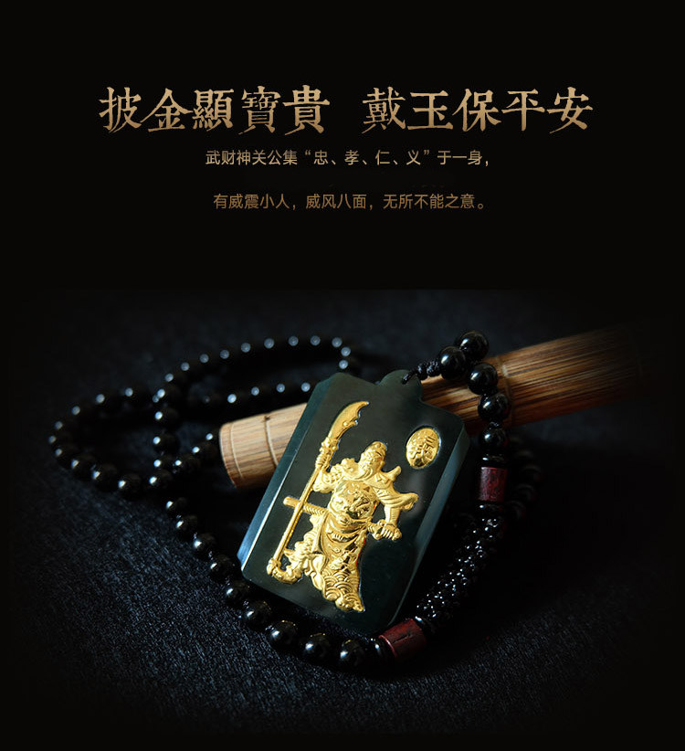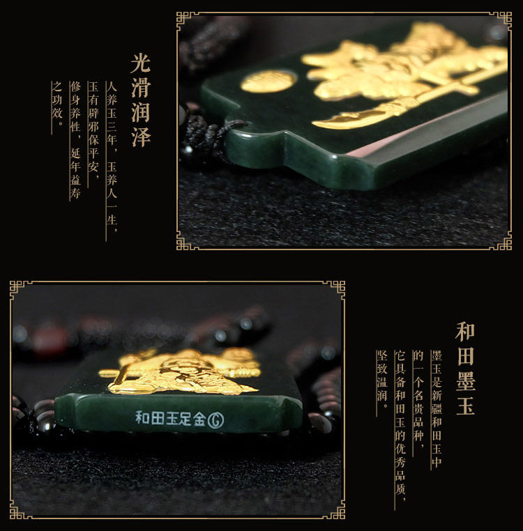 天然金镶玉关公吊坠男士镶嵌黄金关公吊坠和田玉墨玉 玉坠带证书
