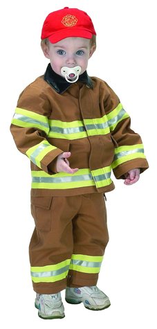 The most official looking bunker gear for kids anywhere. The jr. Fire Fighter Costume is sure to make little kids into big heroes. Includes: Adjustable hard helmet, Adjustable bib overalls with pockets & reinforced knee patches, Adjustable suspenders, Coat with buckles, zipper, pockets, authentic gauntlet cuffs, & reinforced elbow patches
