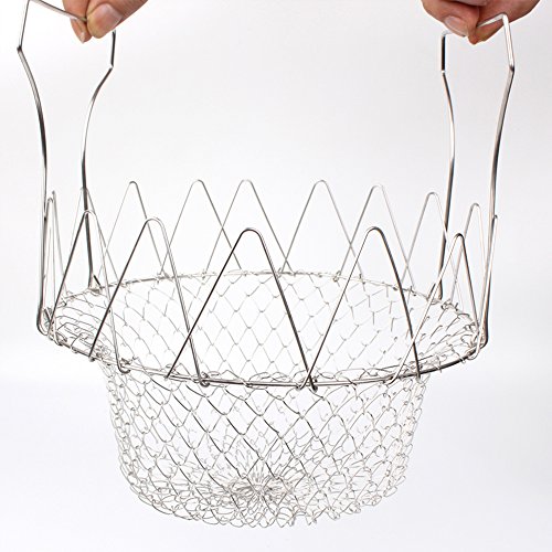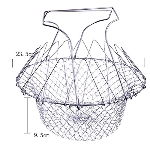 - 2.Multi-function chef basket starts off flat and instantly expands to a flexible basket,can be used to fry the food,store fruit,Snacks.Clean vegetables etc.can also as a colander