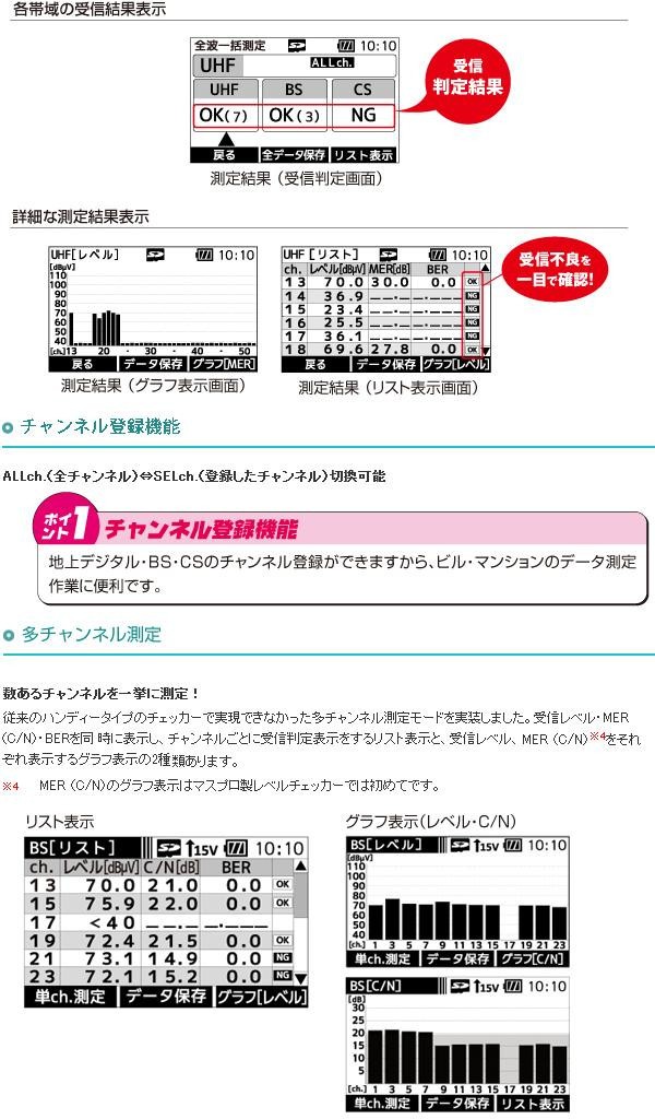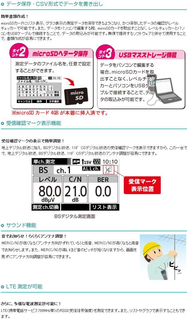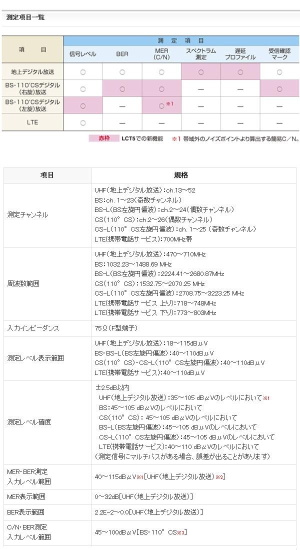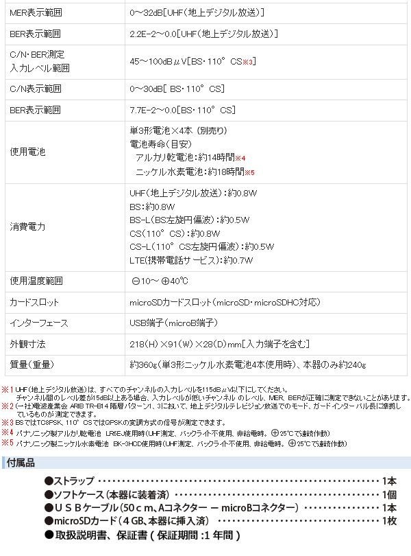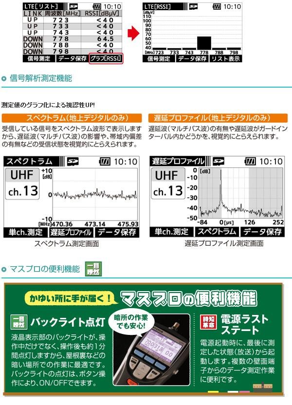 | UHF(地上デジタル放送)、BS・110度CS放送の受信レベル、信号品質に加え、BS左旋・110度CS左旋放送の受信レベル、簡易C/Nと、700MHz帯LTE(携帯電話サービス)の受信レベルを測定できる、ハンディータイプの信号測定器です。 |