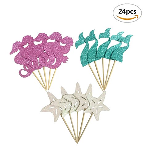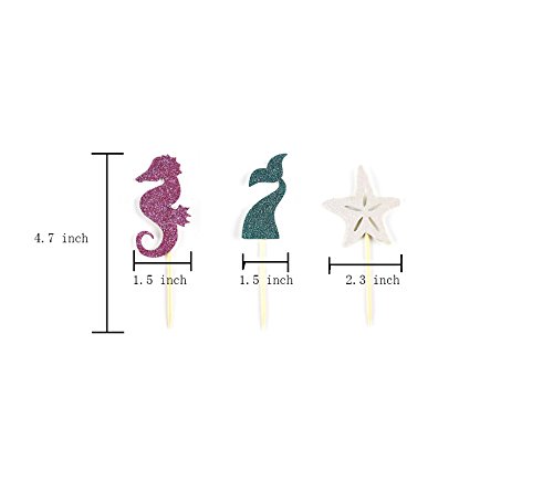 Maydolbone 24pcs Glitter Mermaid Theme Cupcake Toppers- birthday or baby shower Food Picks Decor And Cupcake Party Pick, Fishtail ,Starfish ,Seahorse