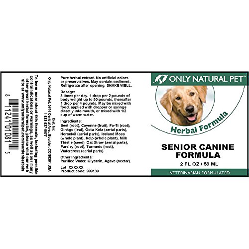 -. Binding : Misc. -. Brand : Only Natural Pet -. Feature : For Pet Type(s): Dogs / Completely Natural / ApproP.R.Iate for all ages and breeds -. Label : Only Natural Pet -. Manufacturer : Only Natural Pet -. MPN : 999019 -. NumberOfItems : 1 -. PackageQuantity : 1 -. PartNumber : 999019 -. ProductGroup : Pet Products -. ProductTypeName : PET_SUPPLIES -. Publisher : Only Natural Pet -. Studio : Only Natural Pet -. Title : Only Natural Pet Senior Canine Herbal Formula