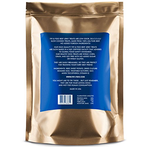 -. Feature : Made in American without foreign ingredients - Fifi & Fido Beefy Jerky Treats are 100% NATURAL, HEALTHY GOURMET SNACKS made with PURE GRADE AMERICAN BEEF. They are WHEAT, CORN, GRAIN, GLUTEN & SOY FREE and NO NASTY FOREIGN INGREDIENTS that are harmful to your pet. Full of protein, our Beef Jerky sticks are the PERFECT ADDITION to a BALANCED DIET / A healthy treat for dogs to eat - SAFER THAN BONES, and unlike biscuits, our TREATS ARE MESS-FREE and only contain ORGANIC WHOLE FOOD INGREDIENTS, which is what your dog needs. But sometimes THE CAT might want some too, and THAT'S OKAY! / Perfect Training Supplies - An all-time favorite of trainers and dog-lovers, our ALL-AMERICAN BEEF JERKY TREATS are IDEAL for use with TRAINING and are loaded with NUTRITIONAL VALUE. They are EASILY BREAKABLE into small rewards, so you'll be surP.R.Ised how much quicker your puppy dog learns when rewarded with our QUALITY TREATS. / Deliciously good & full of flavor - Fifi & Fido Beefy Jerky treats are LOW IN ODOR and won't leave your hands smelling like you just crashed a barbeque! These are a must for every dog lover during training or a trip to the park!