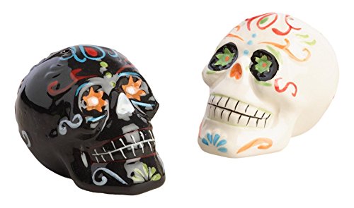 - These black and white ceramic salt and pepper shakers feature colorful designs in the style of Mexican day of the dead sugar skulls
