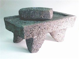 Studio : La Mexicana Publisher : La Mexicana Product Description Metate y Mano (Mortar and Ground Stone) 10" L x 8" W x 6" H Please note that Metate is handmade and measurements can slightly vary. The traditional Aztec metate is slanted and has three short legs; it is made of volcanic rock, basalt or andesite. The slant in the metate allows the grinder to push the ingredients as they are being ground into a bowl set at the end of it. The mano is the long cylindrical stone roller, with which substances are ground and rolled with. Just sit or squat in front of the metate, then scatter grain in the metate, and then roll the mano across the metate back and forth. This back and forth motion pulverizes grains, seeds, or chocolate in an even, smooth and efficient way.E The use of the metate has made women develop strong upper backs and arms. How to Prepare or Season your Metate and Mano before use: Make sure to season your metate before using so there will be no grit in your food. 1. Douse your metate and mano and scrub with a stiff brush. Soak overnight and then let dry for a day. 2. Once the metate is dry, grind a handful of white rich rice, pulverize until the rice turns into grey powder. Discard the gray powder. Grind another handful of rice, and continue grinding until thepulverized fine powder produced is white, which means the loose sand or stones have been removed from your metate. 3. If youOre going to use the metate to grind spices, then just follow the rice procedure. If youOre grinding corn, then substitute the rice for corn and discard the first batch. 0