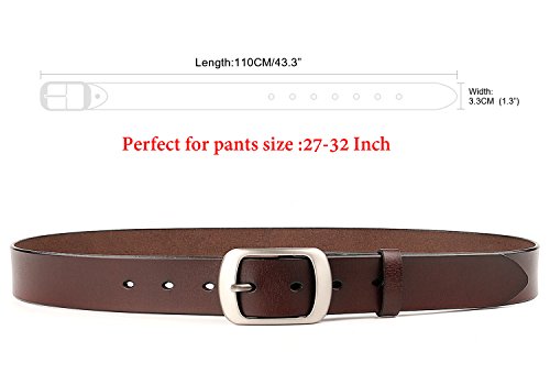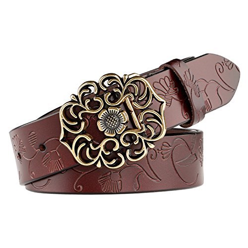 Western Leather Belt For Women Product Features: 1.Belt Size:The total length included buckle is 110cm(43.3 Inch) Width:3.3cm(1.3Inch),Perfect for Waist Size 28-32 Inch( Referential US size 8-14) 2.Buckle Size:length: 6cm(2.36 Inch),Width:5cm(1.96Inch). 3.Material: Genuine Leather Vintage Hollow Out Flower Buckle. 4.Unique and fashion design,More Comfortable and Durable 5.Awesome casual accessory for indoor and outdoor activities.