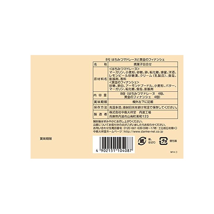 원본상품명: Hitotoe はちみつマドレヌと金のフィナンシェ 8個