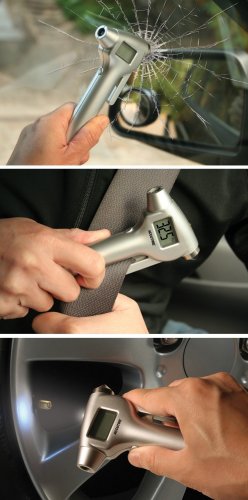 - Feature : Metal safety hammer with extra features / Reads tire pressure from 5 to 150 PSI / Easy to read large tire pressure display / Emergency seat belt cutter / Built-in white LED flashlight