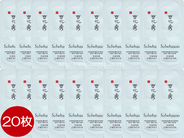 【商品説明】 芸能界にも愛用者の多い韓国の高級化粧品ソルファス(雪花秀)の美 白ラインの中の一つです。 雪花秀滋晶シリーズの最高峰エッセンス ― 滋晶美 白スポットトリートメントです。 滋晶美 白スポットトリートメントを気になるところに塗るだけでもう美 白が始まります。 局所部位の色素沈着をケアします。 白参サポニン成分がメラニン生成を抑制してしみなどを改 善してくれます。 色素沈着が気になるところに集中的に塗るとしみの原因を遮断します。 【使用方法】 朝、夕の手入れをする時、スポットエッセンスを真珠一粒サイズの量で、シ ミなどが心配されている部分に小さな円を描きながら十分に吸収させます。 【使用手順】潤燥エッセンス → 滋晶水(化粧水) → 滋晶美 白エッセンス → 滋晶 乳液 → 滋晶美 白スポットトリートメント → (朝)常白クリーム 【内容量】 20枚(20ml)