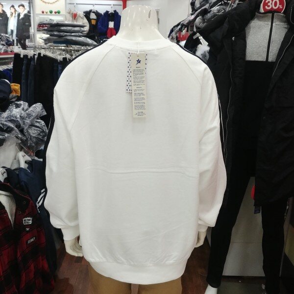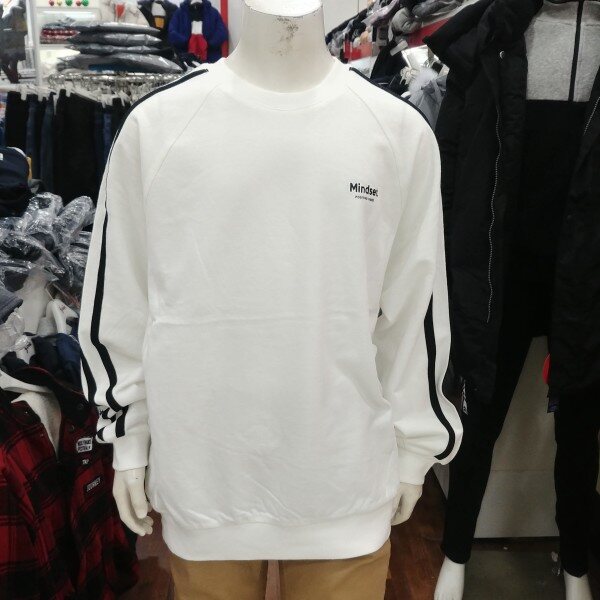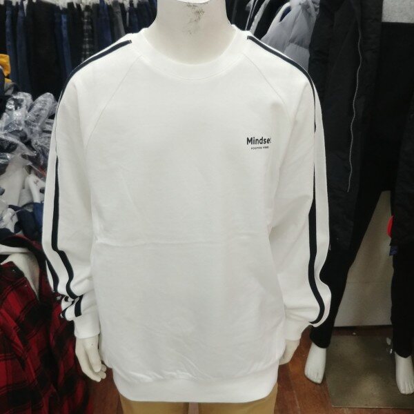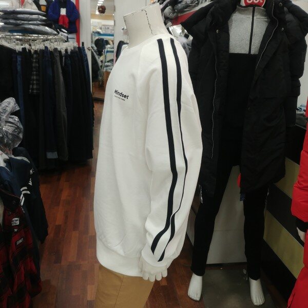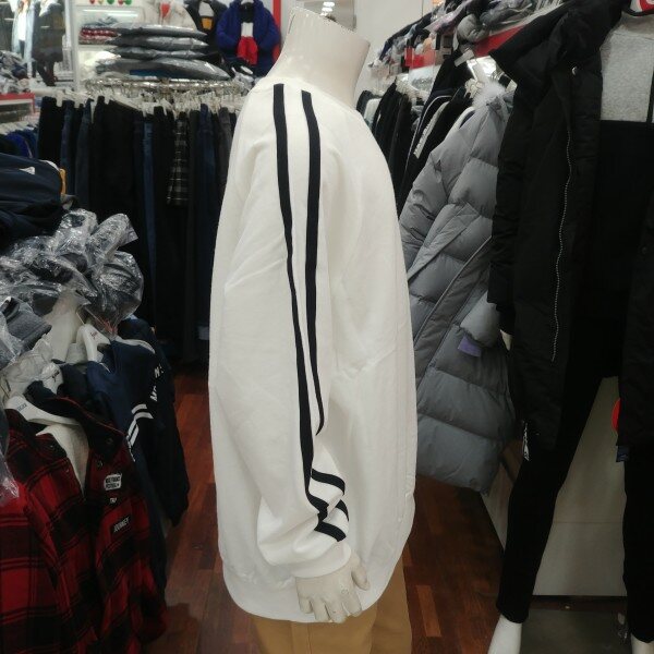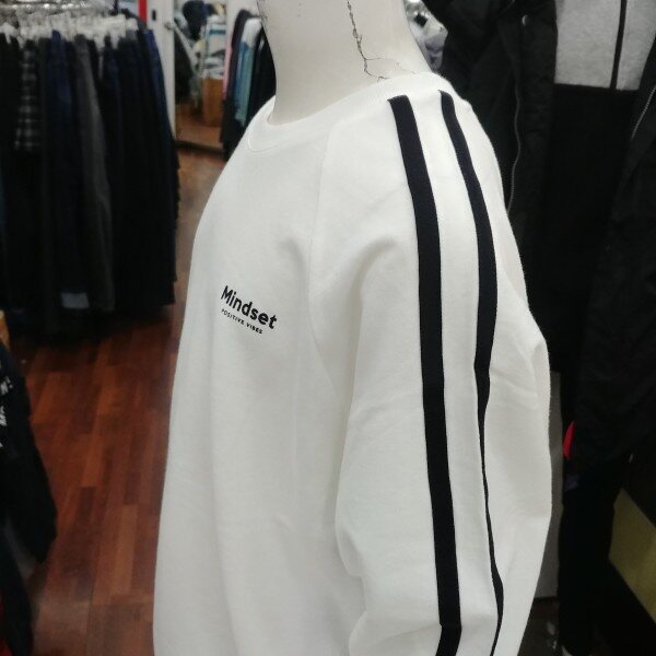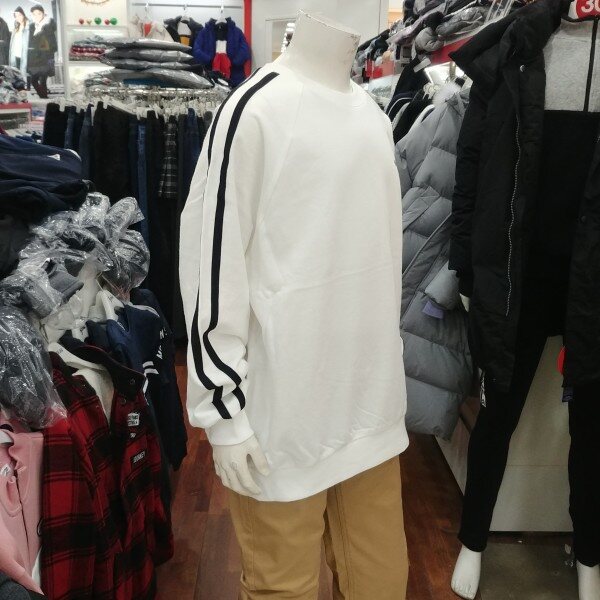 굉장히 단순한 기본 맨투맨티입니다.화이트 바탕에 2선의 블랙 트랙이 돋보입니다.남녀 공용입니다.오버핏으로 입으실때엔 한 사이즈 위로 입으셔도 좋습니다.소매 길이의 차이가 있습니다.
