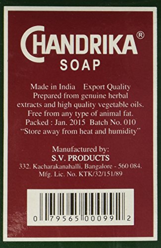 -. Binding : Health and Beauty -. Brand : Chandrika -. EAN : 0079565000992 -. Feature : Chandrika bar soap quantity: 10 and size: 75 gm / Quantity: 10 pack / Size: 75 grams -. IsAdultProduct : 0 -. Label : Chandrika -. LegalDisclaimer : Actual product packaging and materials may contain more and different information than what is shown on our website. We recommend that you do not rely solely on the information presented and that you always read labels, warnings, and directions before using or consuming a product. Please see our full disclaimer below. -. Manufacturer : Chandrika -. Model : SOAPCS75 -. MPN : SOAPCS75 -. NumberOfItems : 10 -. PackageQuantity : 10 -. PartNumber : SOAPCS75 -. ProductGroup : Beauty -. ProductTypeName : BEAUTY -. Publisher : Chandrika -. Size : 2.62 oz -. Studio : Chandrika -. Title : Chandrika Bath Soap Ayurvedic, 75g, 10 Pack -. UPC : 079565000992