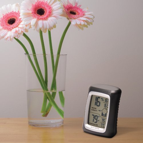 -. Feature : Measures humidity and temperature / Records levels to display highs and lows / Magnetic backing for convenient placement / Displays in Celsius or Fahrenheit / Black