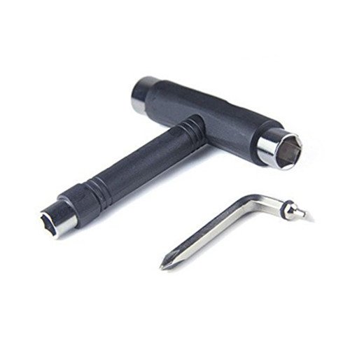 maxfind All-In-One Skate Tools Weight: 125g Length: Approx.10.3cm x 9cm(L*W) Color: Black Fit for: Axle nuts, external hexagon main nail, standard nuts, inner hexagon screws fixing, cross screws fixing.? Package Contents:? 1 X Skateboard Tool? Professional T shape design with multi-function. With durable construction and superior material made.? 3 sockets (at 3 ends of T shape Tool) with different sizes for Tightening and mounting trucks, wheels, bearings.? A screwdriver that fits into the tool handle.? T shape user-friendly design for comfortable use.? Light and small to carry around.? Features:? A high quality skate tool that comes in handy when setting up a board or making adjustments.? Just what every skateboarder or skater should have in there bag on days out.? A great light weight tool.? Removable Phillips head screwdriver Allen Key tool for the truck fixing bolts which fits inside the t-tool handle when not required.? For Skateboards it will fit axle nuts, kingpins and truck fixing bolts.? Perfect for virtually any skateboard.? Allen Key and Phillips head.