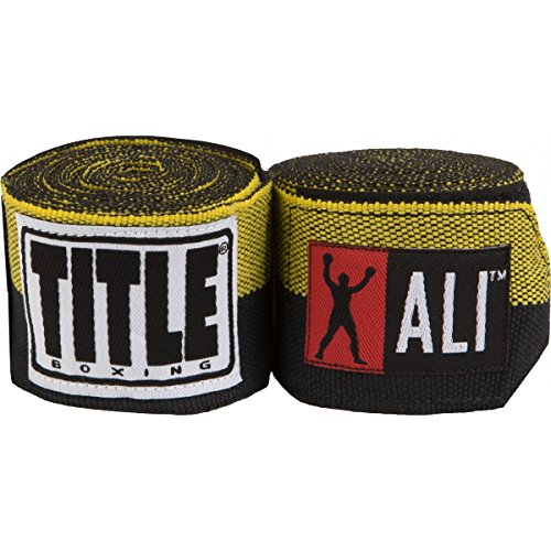 -. Binding : Misc. -. Brand : Title Boxing -. Color : Gold/Black -. Feature : High quality semi-stretch wraps manufactured with a perfect blend of polyester and Spandex blend / Reinforced starter thumb loop and hook-and-loop closure / Extra-long 180" length for added coverage and protection / Sold in pairs -. Label : TITLE Boxing -. Manufacturer : TITLE Boxing -. MPN : 116563 -. PartNumber : 116563 -. ProductGroup : Sports -. ProductTypeName : SPORTING_GOODS -. Publisher : TITLE Boxing -. Studio : TITLE Boxing -. Title : Muhammad Ali Semi-Stretch Hand Wraps, Gold/Black