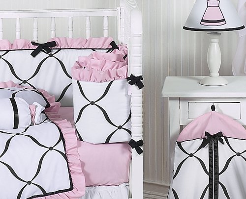-. Feature : 9 Piece Set Includes: (1)Crib Blanket, (1)Bumper, (1)Fitted Sheet, (1)Skirt, (2)Window Valances, (1)Diaper Stacker, (1)Toy Bag and (1)Throw Pillow / **Sweet Jojo Designs also offers an 11 piece bumperless set / This set is made of 100% Cotton, Brushed Microfiber, Satin and Sheer Organza. Machine Wash cold, gentle cycle. Tumble dry low. / Pink, Black and White / This design has matching accessories such as hampers, lamp shades, window treatments and wall decor.