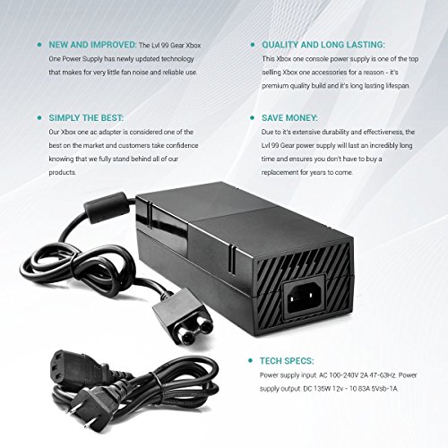-. Binding : Video Game -. Brand : Lvl99Gear -. EAN : 0642078947711 -. ESRBAgeRating : Rating Pending -. Feature : NEW AND IMPROVED: The Lvl 99 Gear Xbox One Power Supply has newly updated technology that makes for very little fan noise and reliable use. / SIMPLY THE BEST: Our Xbox one ac adapter is considered one of the best on the market and customers take confidence knowing that we fully stand behind all of our products. / QUALITY AND LONG LASTING: This Xbox one console power supply is one of the top selling Xbox one accessories for a reason - it's premium quality build and it's long lasting lifespan. / SAVE MONEY: Due to it's extensive durability and effectiveness, the Lvl 99 Gear power supply will last an incredibly long time and ensures you don't have to buy a replacement for years to come. / TECH SPECS: Power supply input: AC 100-240V 2A 47-63Hz. Power supply output: DC 135W 12v - 10.83A 5Vsb-1A. -. HardwarePlatform : Xbox One -. Label : LVL99Gear -. Manufacturer : LVL99Gear -. PackageQuantity : 1 -. ProductGroup : Video Games -. ProductTypeName : VIDEO_GAME_ACCESSORIES -. Publisher : LVL99Gear -. Studio : LVL99Gear -. Title : Xbox One Power Supply - Certified and Quiet - AC Adapter - Premium Xbox One Accessories -. UPC : 642078947711