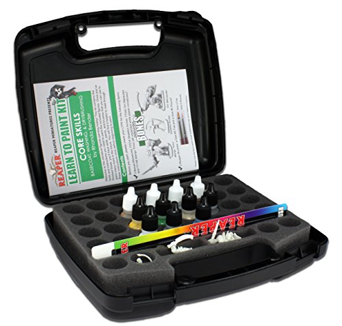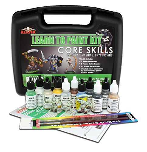This Kit includes: 11 Bottles of MSP Core Colors and MSP HD Paint, 2 Brushes, 3 Bones Miniatures (Pictured) and an instruction Guide by Rhonda Bender. 11 Master Series Paints included are: 9030: Leather Brown, 9037: Pure Black, 9039: Pure White, 9053: Honed Steel, 9054: Polished Silver, 9085: Shadowed Stone, 9200: Harvest Brown, 9228: Viper Green, 9271: Dirty Bone, 29815: Dragon Blue, 29809: Pale SaffronFeature