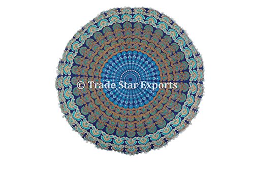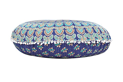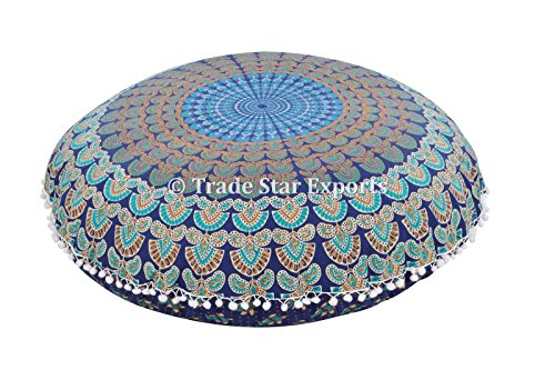 Large Mandala Floor Pillow, Indian Outdoor Cushion Cover, Decorative Throw Pillowcases 32", Round Pouf Ottoman, Boho Pillow Shams, Pom Pom Roundie Cushion