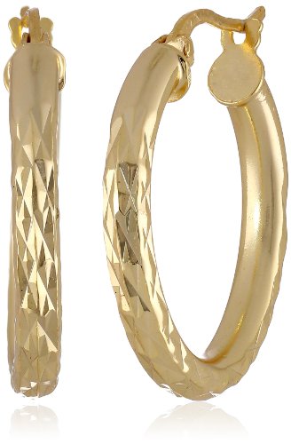 A diamond-cut finish adds sparkle and shine to these round hoop earrings, crafted in radiant gold-dipped sterling silver. These small hoops are easy to dress up or down and will complement plenty of outfits. They secure easily with hinged snap posts.