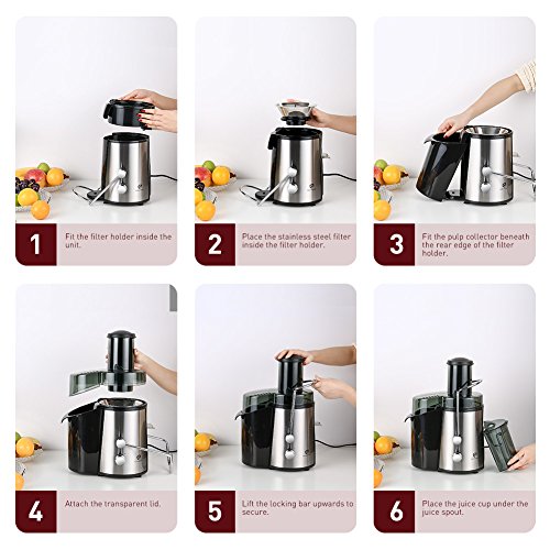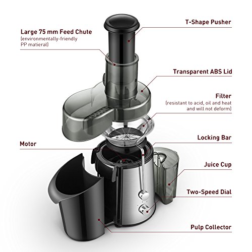 EXTRA WIDE MOUTH JUICE EXTRACTOR: Extra-large 75 mm/3 in feed chute directly accepts small ingredients; cut any larger fruits and vegetables into smaller portions to juice; the larger chute is convenient when preparing to juice