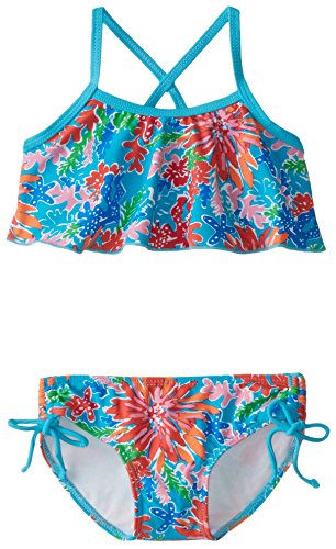Kanu Surf presents our newest swim styles yet. Kanu, a surf and swim lifestyle brand, is well known for great prints and colors along with high quality functional apparel for the whole family. All of our swimwear is made with a high quality nylon/spandex tricot fabric and are lined both front and back. All of our prints are available in 1 or 2 pc options. Kanu swimwear is great for the active athlete as well as for the recreational swimmer. Our Ariel flounce bikini sports a cool tripcal print. Available in all girls sizes infant thru 16 so sisters can hit the beach scene as a team. Check out the coordinating boardshort and rashguard for a great setFeature